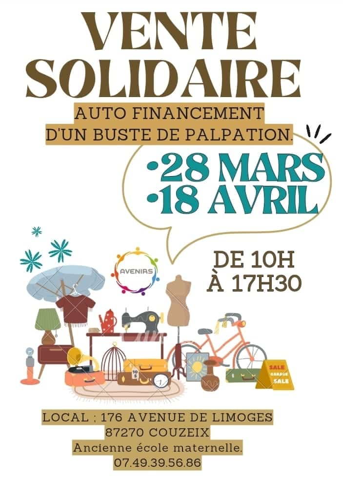 Première journée de la vente solidaire de l'associaAvenirsenirs, de 10h à 17h30, annexe jean moulin (ancienne école maternelle - entrée par le parking de la mairie) 🎉