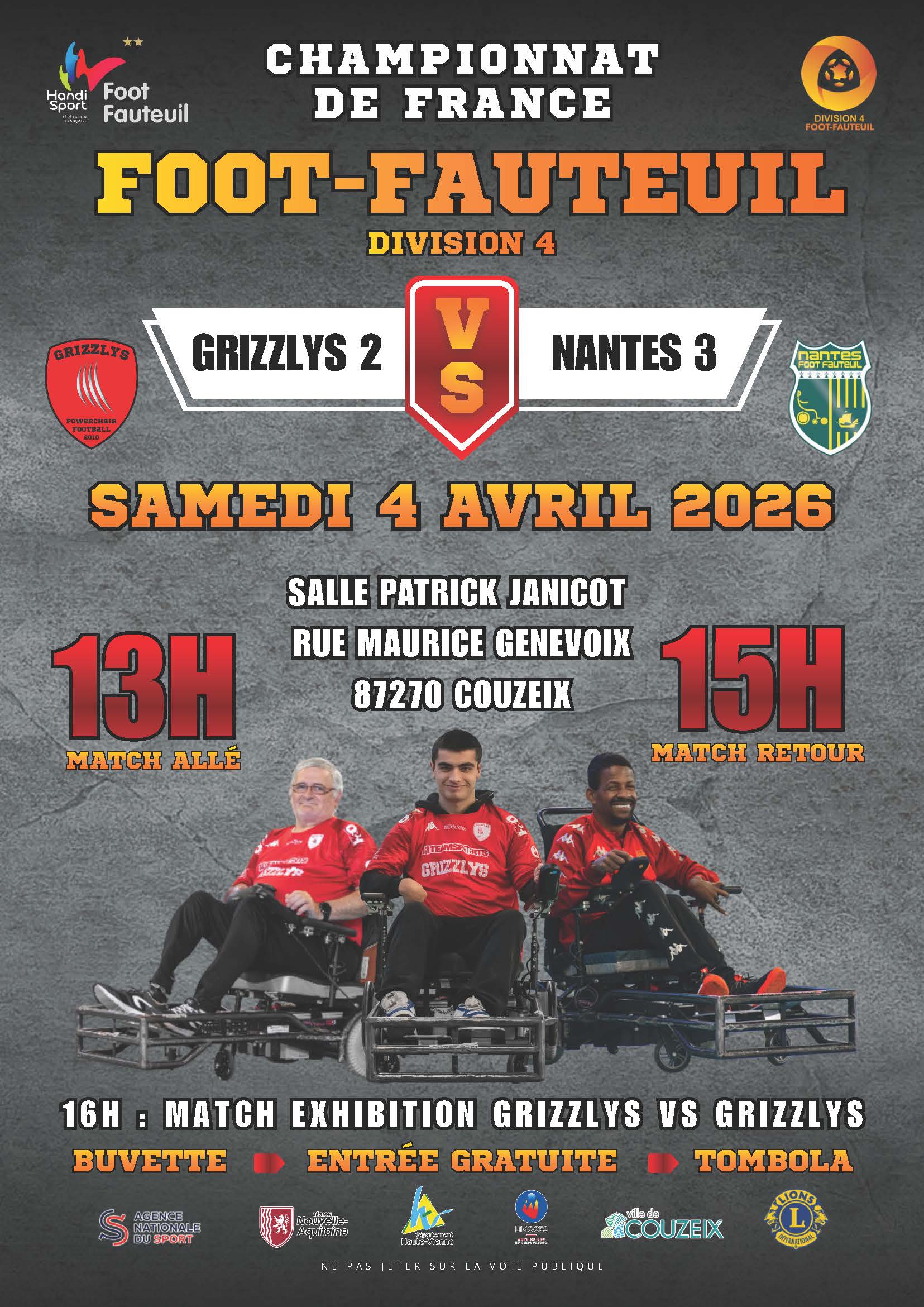 Samedi 4 avril, venez encourager les Grizzlys Foot Fauteuil 2 face à Nantes 3 au gymnase Janicot !