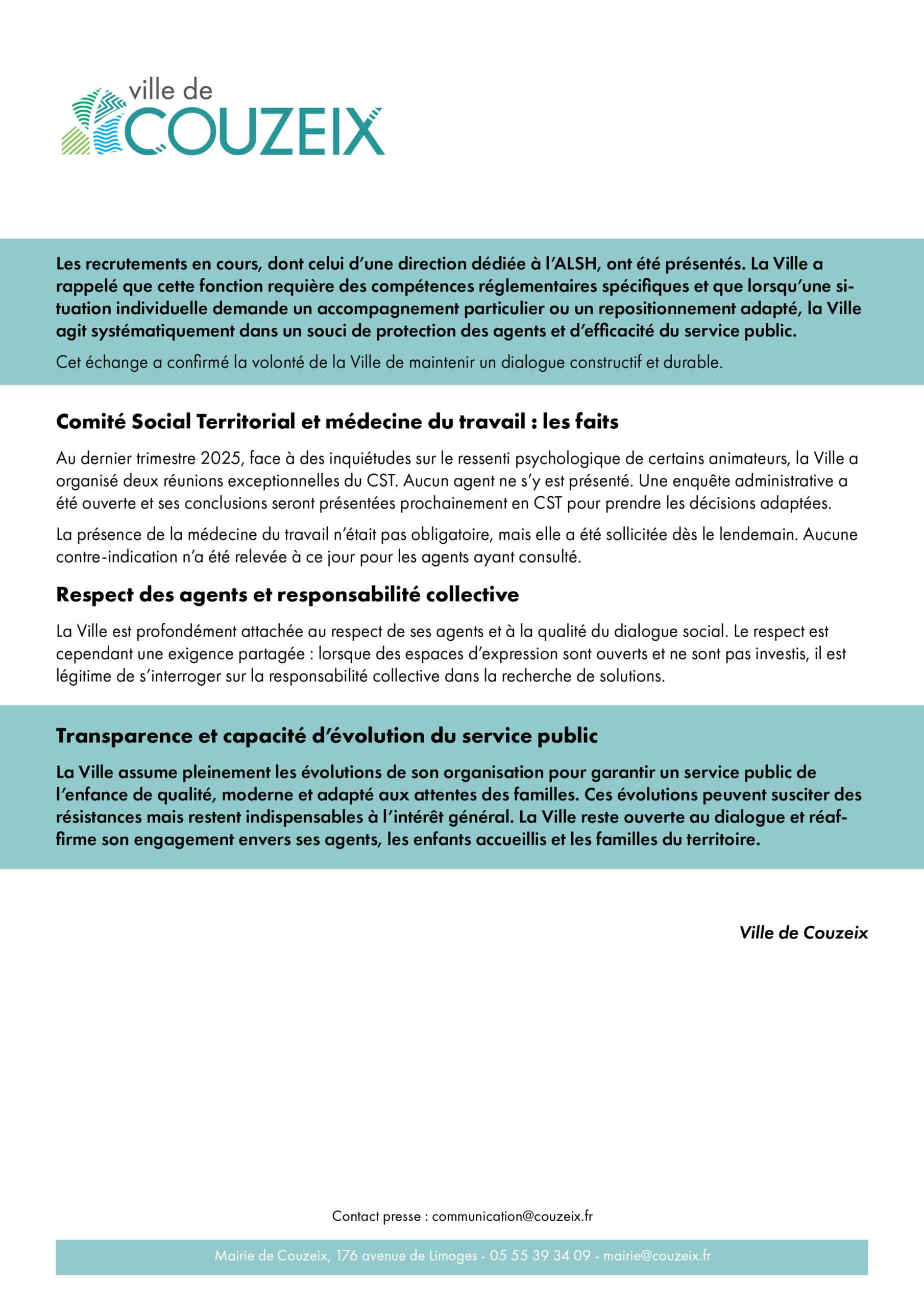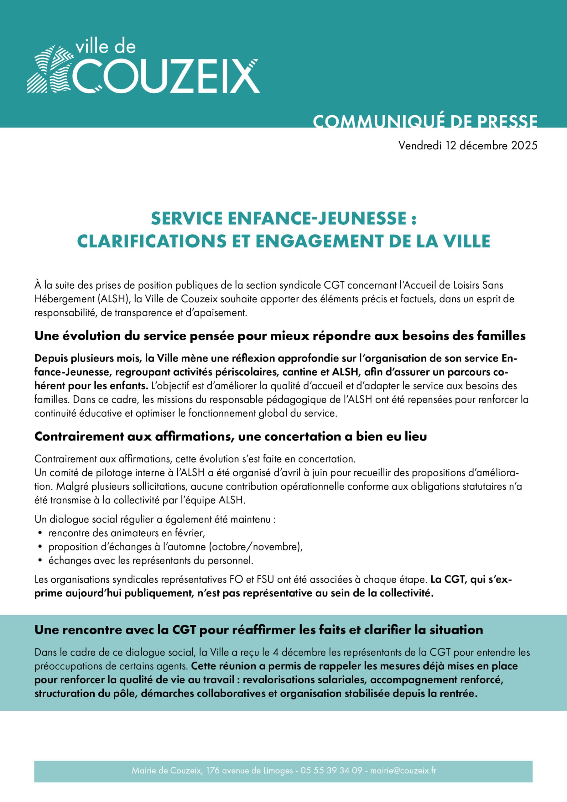 Communiqué de presse de la ville : Service Enfance-Jeunesse – clarifications et engagement de la Ville