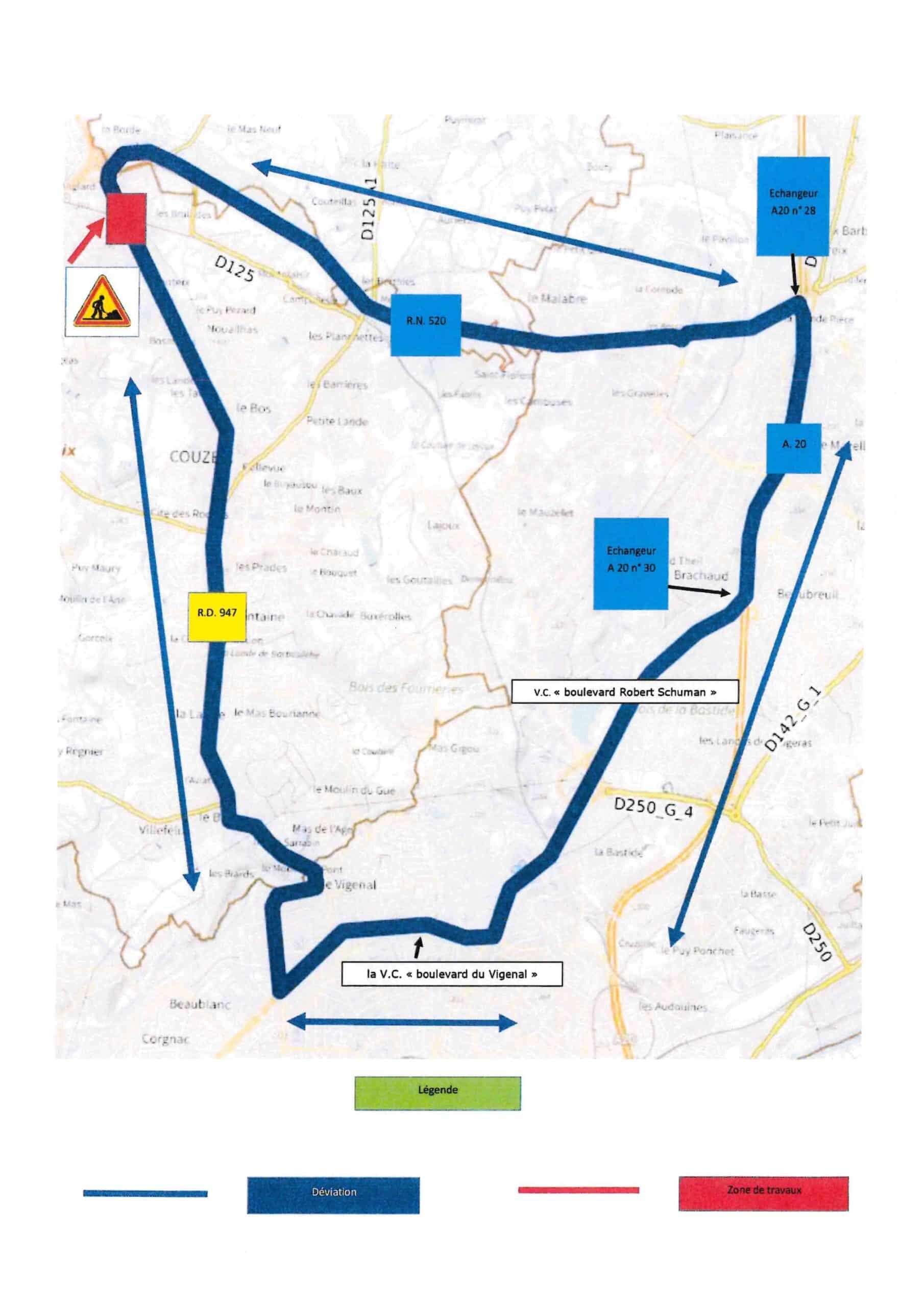 Ces travaux, réalisés sur le territoire de la commune de Couzeix (hors agglomération), nécessiteront la mise en place d’une déviation pendant une nuit, entre 20h et 7h, au cours de la période du 12 au 14 novembre 2025.