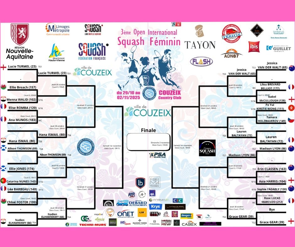 La ville de Couzeix est fière de soutenir la 3ᵉ édition du PSA International Féminin, organisée par le Country Club Squash de Couzeix. Après deux premières éditions réussies, le tournoi revient avec une grande nouveauté : un terrain vitré panoramique, une première dans l’histoire de l’épreuve. Ce court innovant offrira au public une vision à 360° de chaque échange et une immersion totale dans le spectacle.