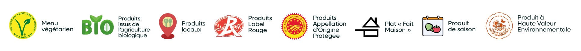 Les produits soigneusement sélectionnés : signes officiels de qualité (AOP, IGP, Label Rouge, HVE), produits locaux et de saison, issus de l’agriculture biologique, avec une large part de préparations réalisées en fait maison. Ces choix soutiennent les filières agricoles, réduisent l’impact environnemental et garantissent des repas savoureux.