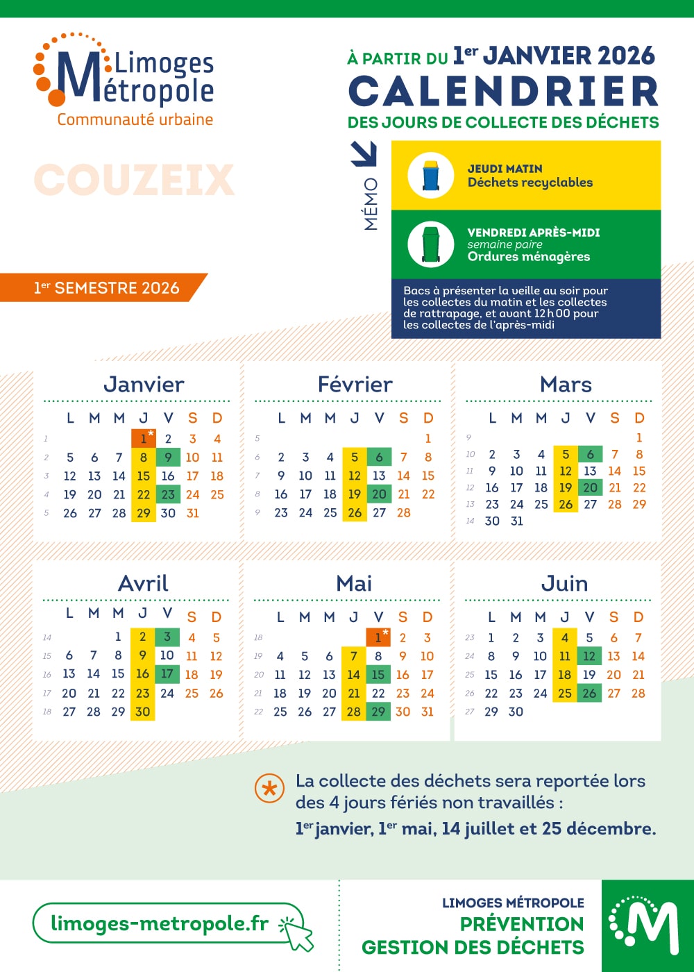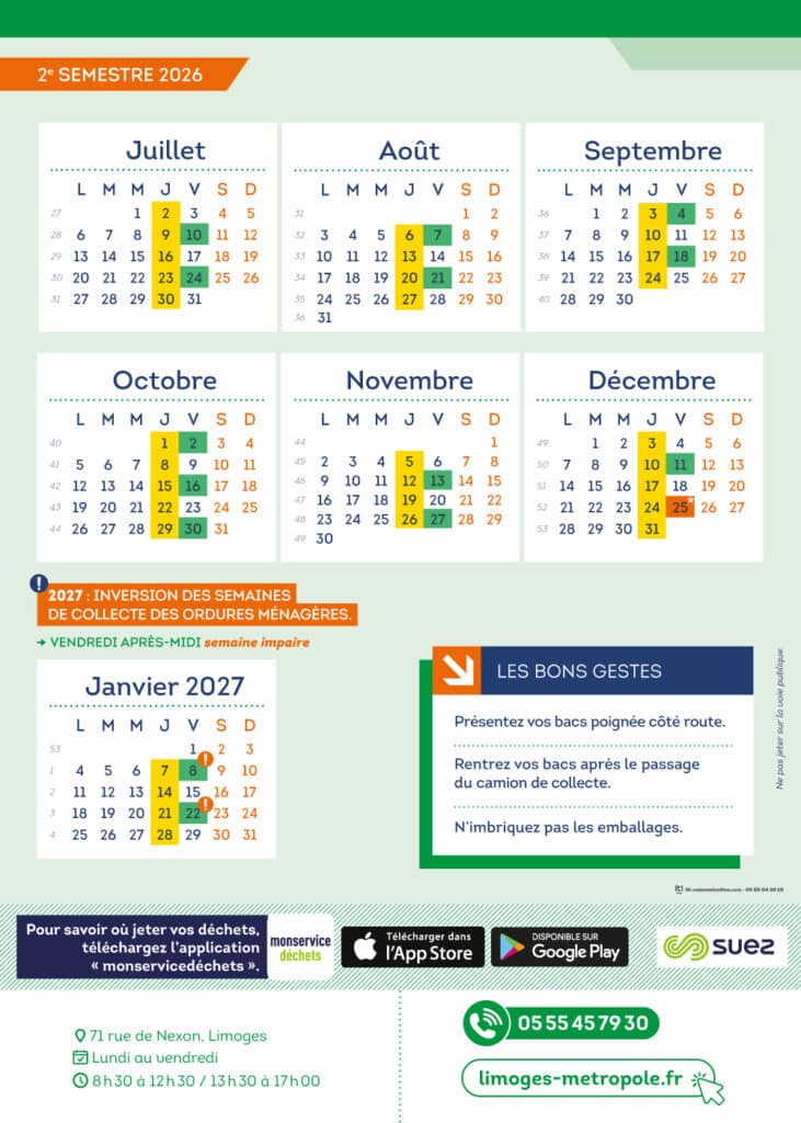 Veuillez trouver ci-dessous le calendrier 2026 de collecte des déchets assurée par Limoges Métropole. Pour rappel, les collectes des bacs roulants se font 6 jours sur 7, du lundi au samedi. Les tournées en porte-à-porte se font de 5h à 12h et de 13h à 20h.